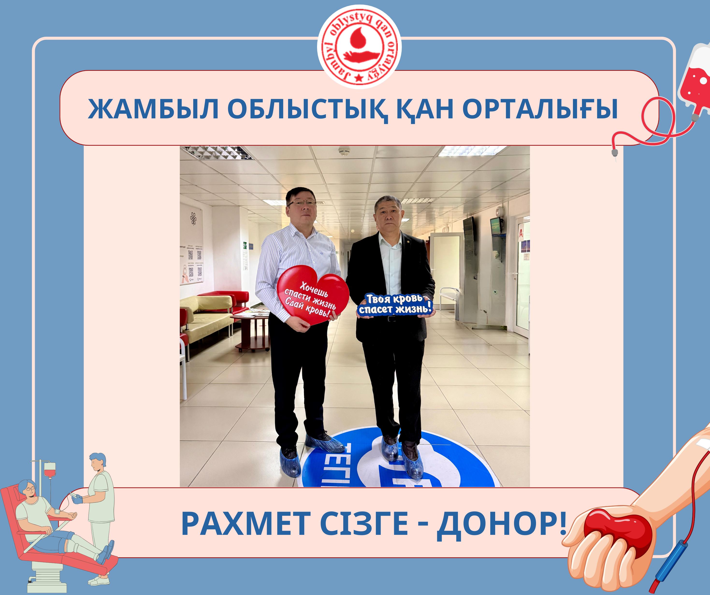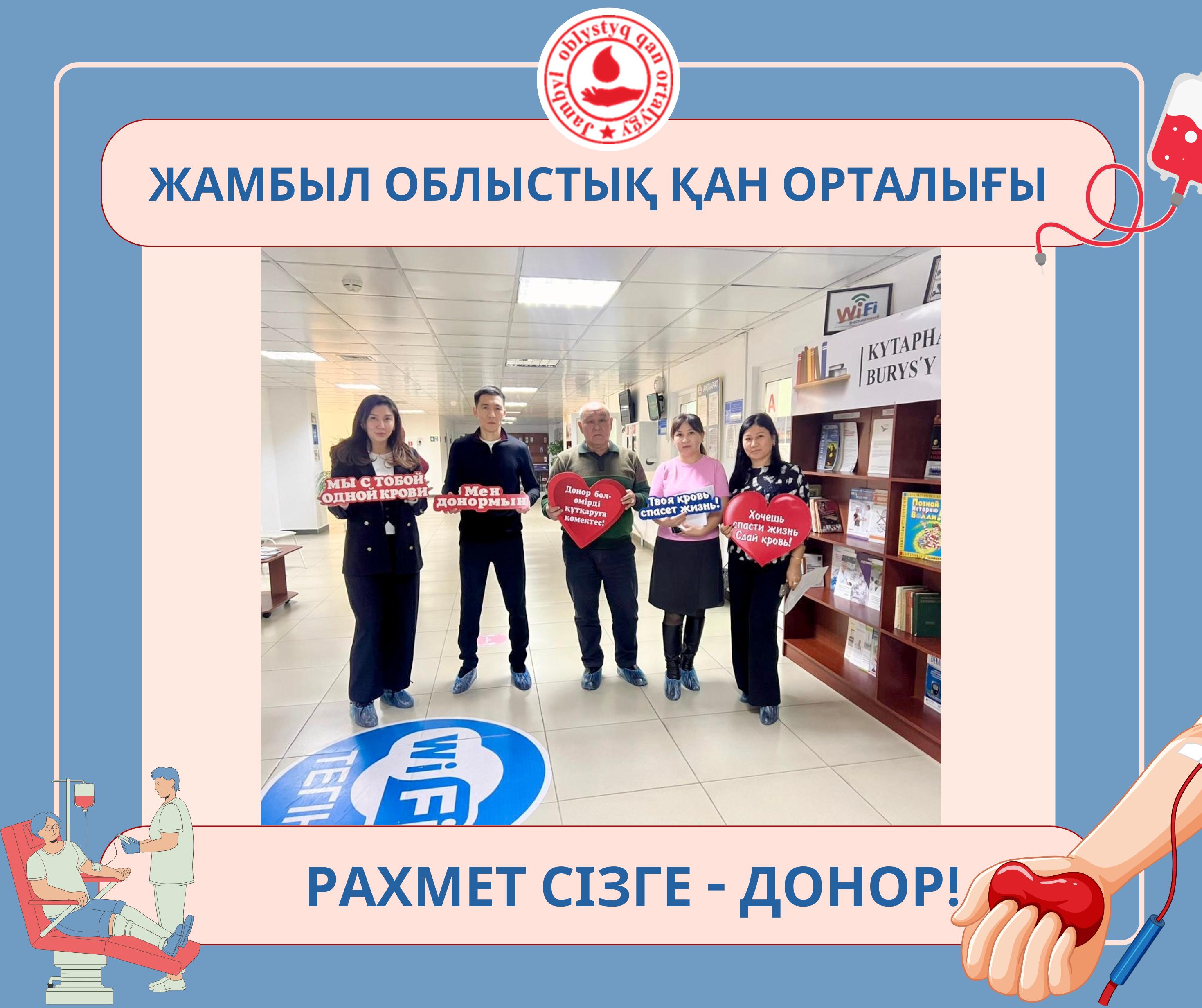 Бүгін осындай қос құрылымның өкілдері қан орталығына арнайы келіп, өтеусіз донорлықтың дамуына өзіндік үлестерін қосты. Әуелі Жамбыл облыстық Әділет департаментінің басшысы Мейіржан бастаманы қолдап, осы маңызды іске елеулі үлес қосты. Іс-шараны бас маман Айгерім Момбекова ұтымды ұйымдастыра білді. Келесі кезекте Жамбыл облысы бойынша мемлекеттік кірістер департаментінің ұжымы сауапты да жауапты істің бел ортасынан табылды. Бірі әділеттілік қағидаттарын қалыптастырып, бірі қазынаның қоржынын толықтырып отырған жауапты мекемелердің мұқтаж адамдар үшін қан тапсыруға келуі, өтеусіз донорлықты дамытуға деген оң көзқарасы бізді бір серпілтіп тастады. Осы орайда департамент басшылары мен барша донорларға зор алғысымызды білдіреміз.