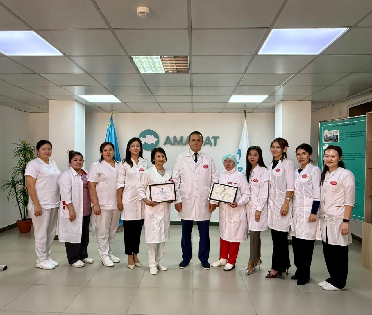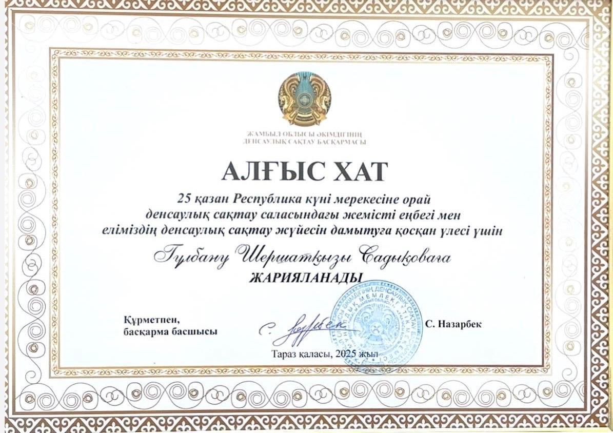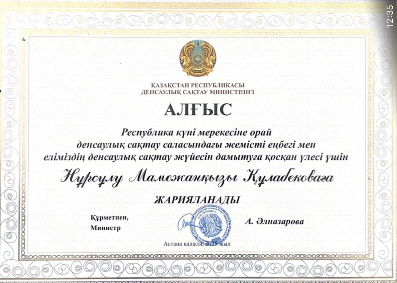 В ходе мероприятия наши коллеги Нурсулу Құлабекова была награждена Благодарственным письмом Министра здравоохранения Республики Казахстан 🇰🇿 за плодотворную работу в сфере здравоохранения и значительный вклад в развитие системы здравоохранения страны. Также Гульбану Садыкову наградили Благодарственным письмом от Управления здравоохранения акимата Жамбылской области.