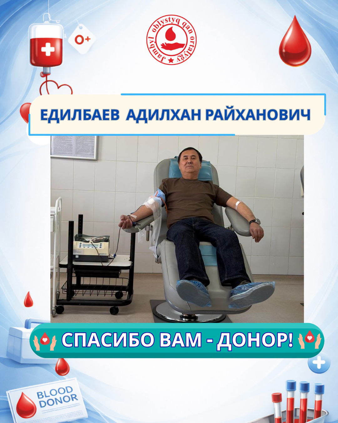 Выражаем искреннюю благодарность депутату Жамбылского районного маслихата Адилхану Райхановичу Едилбаеву за участие в донорской акции и сдачу крови.